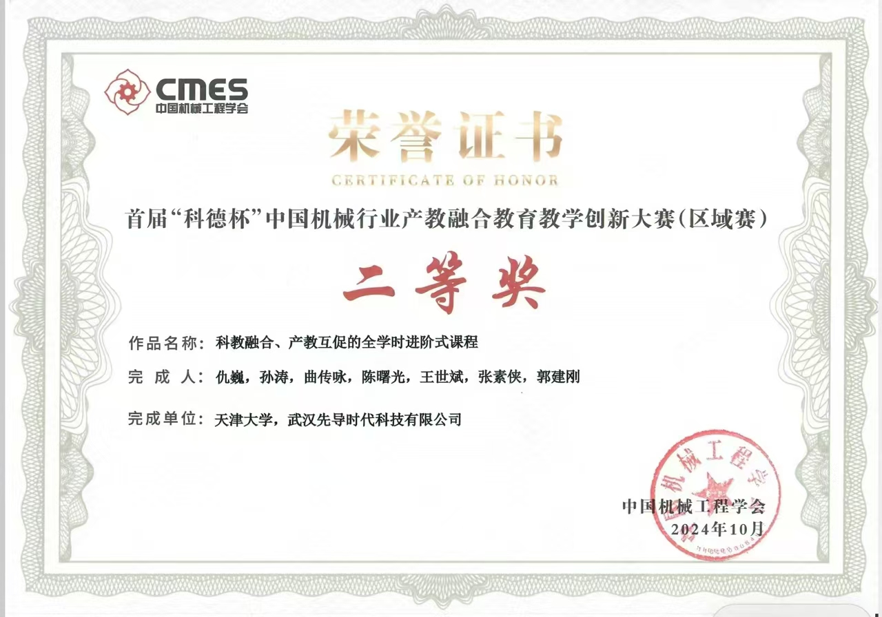 近日,2024年首届“科德杯”中国机械行业产教融合教育教学创新大赛(区域赛)结果发布,武汉先导时代科技有限公司与天津大学联合完成的“科教融合、产教互促的全学时进阶式课程”获大赛二等奖。
